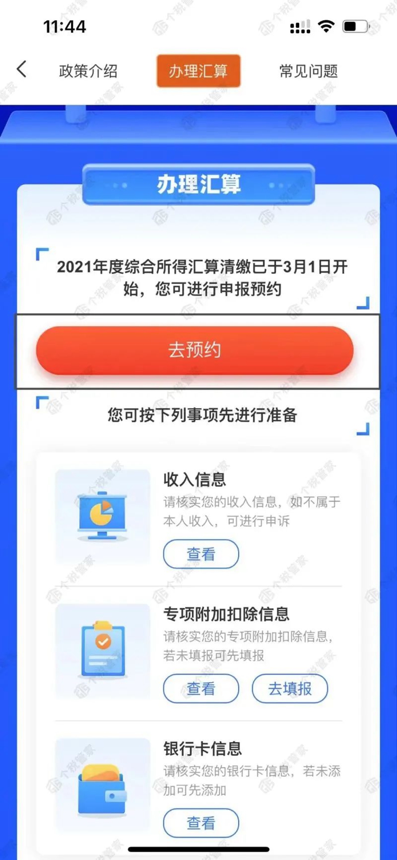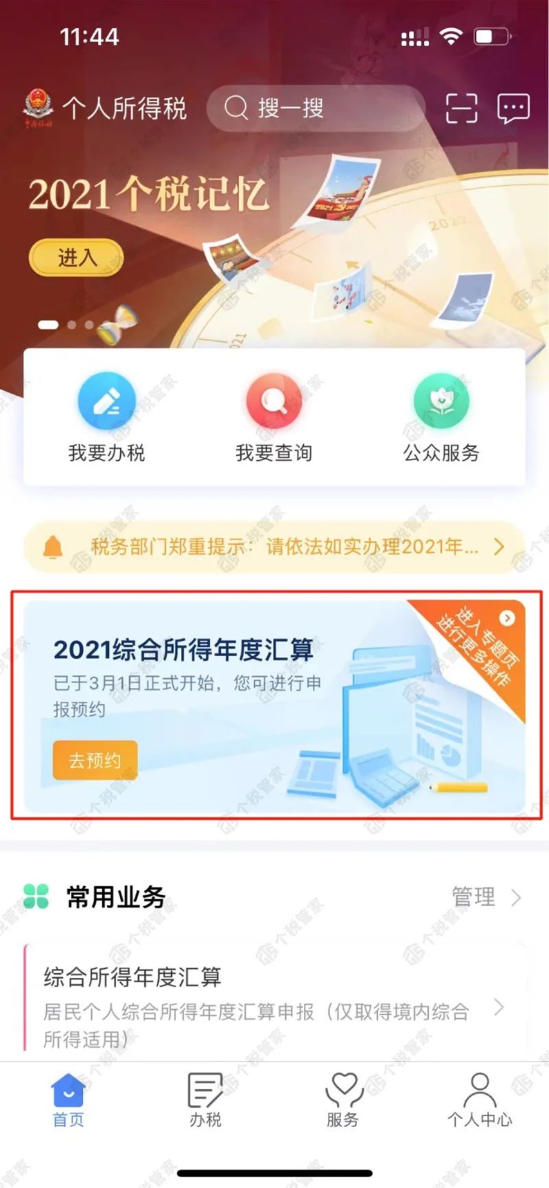 登錄個(gè)稅APP首頁(yè),選擇【2021綜合所得年度匯算】--【去預(yù)約】。