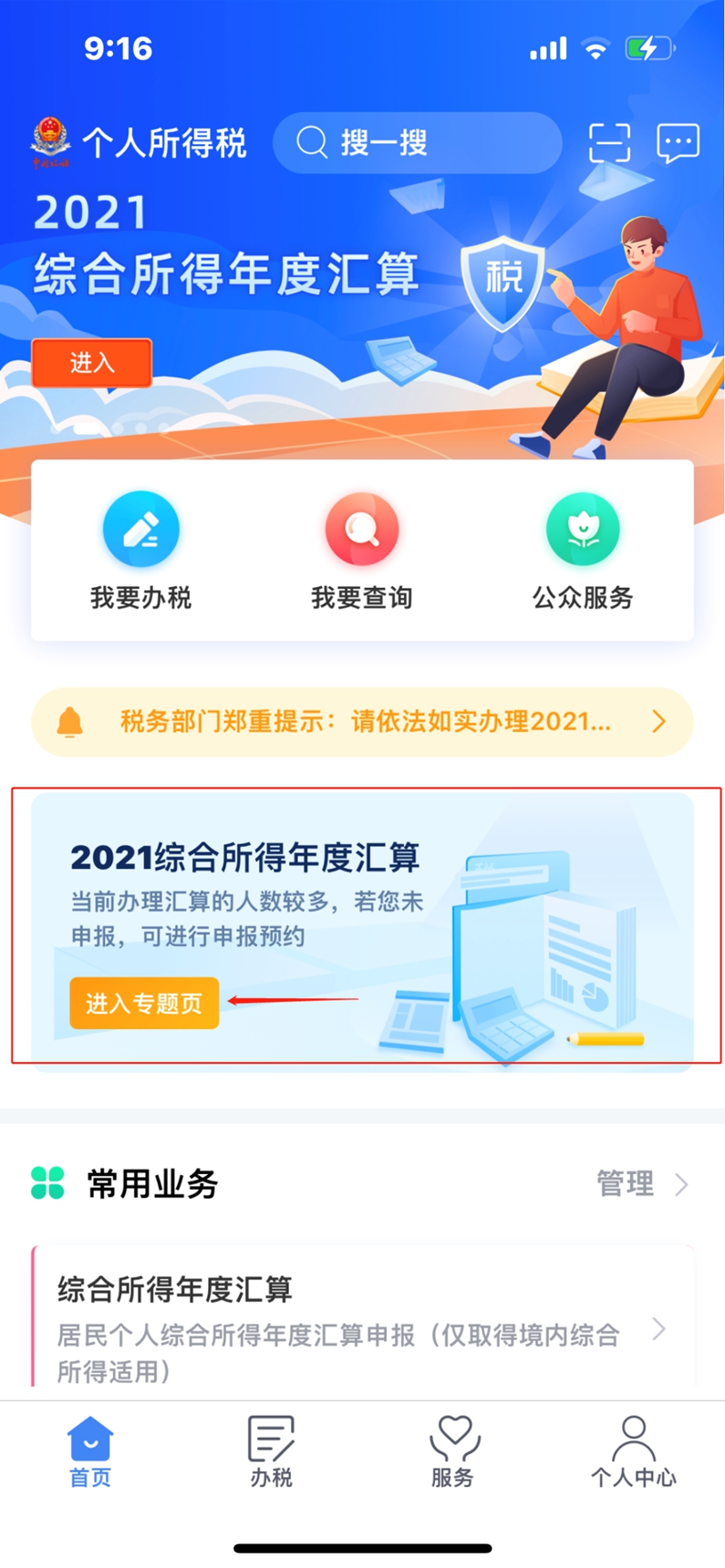 登錄個(gè)稅APP--找到2021綜合所得年度匯算,點(diǎn)【進(jìn)入專題頁(yè)】