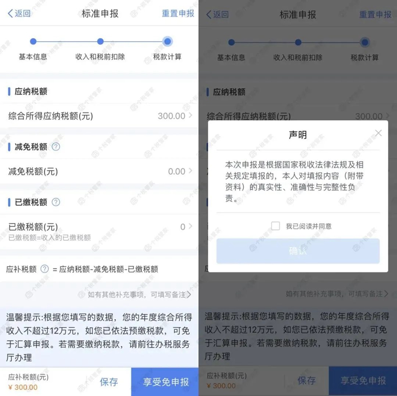 7.如果在標(biāo)準(zhǔn)申報(bào)頁(yè)面,提示有應(yīng)補(bǔ)稅額,在年收入不足12萬(wàn)元或者補(bǔ)稅金額≤400元的情況下,可以點(diǎn)【享受免申報(bào)】。