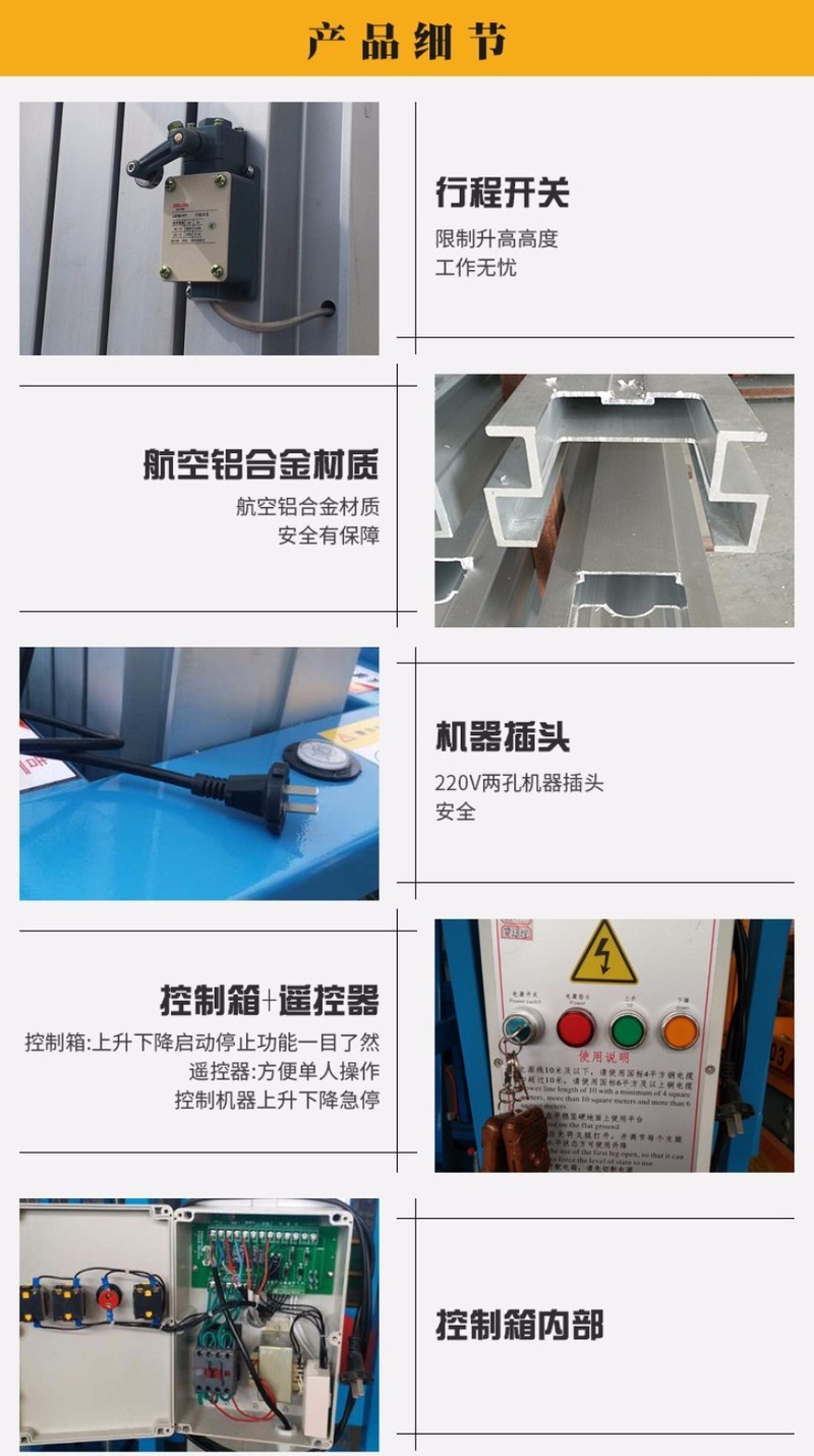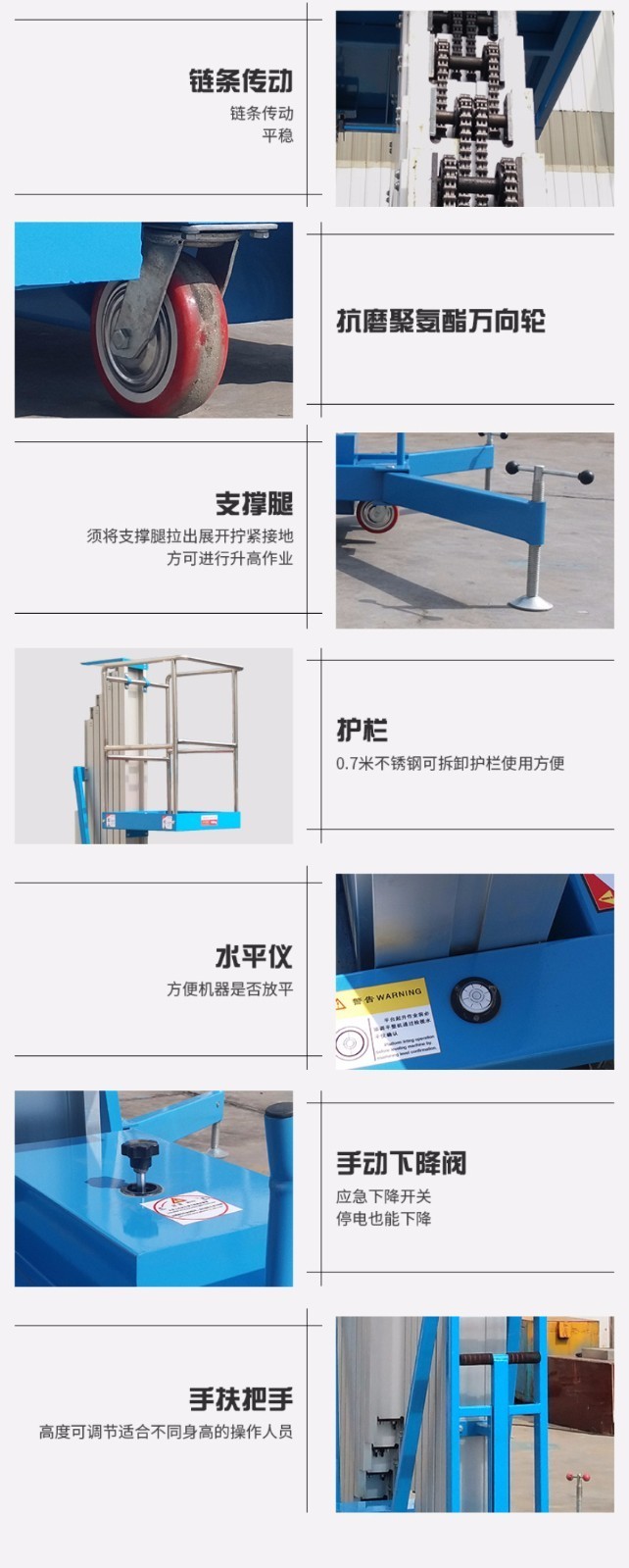 ● 工作平臺(tái)上下方均安裝操作按鈕及應(yīng)急停止按鈕,保證操作人員的人身安全